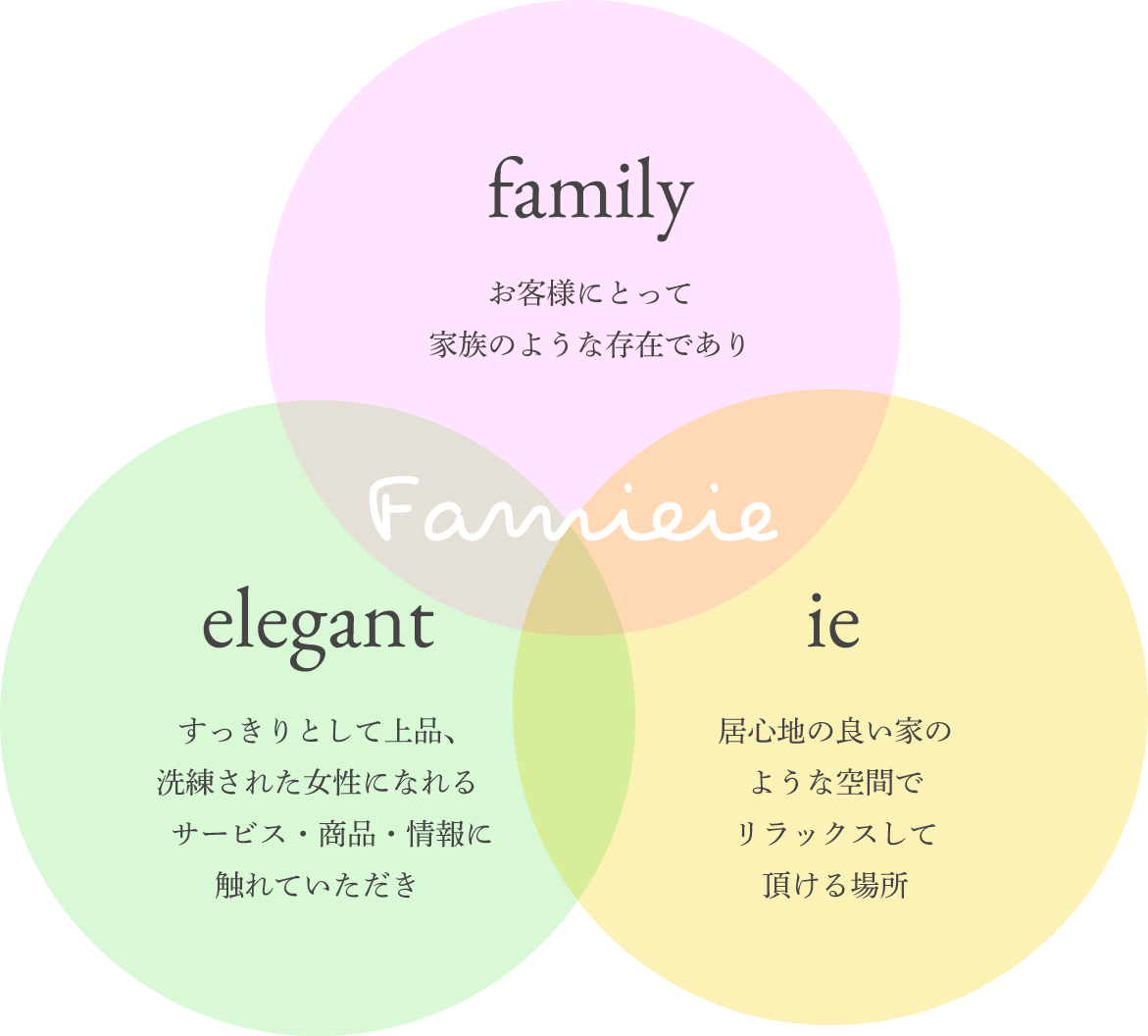 ファミエールはお客様にとって家族のような存在であり、すっきりとして上品、洗練された女性になれるサービス・商品・情報に触れていただき、居心地の良い家のような空間でリラックスしていただける場所を目指しています。